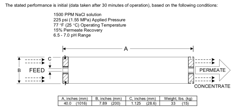 • Lưu lượng dòng chảy – Permeate Flow: 11,000 gpd (41.6 m3/d)